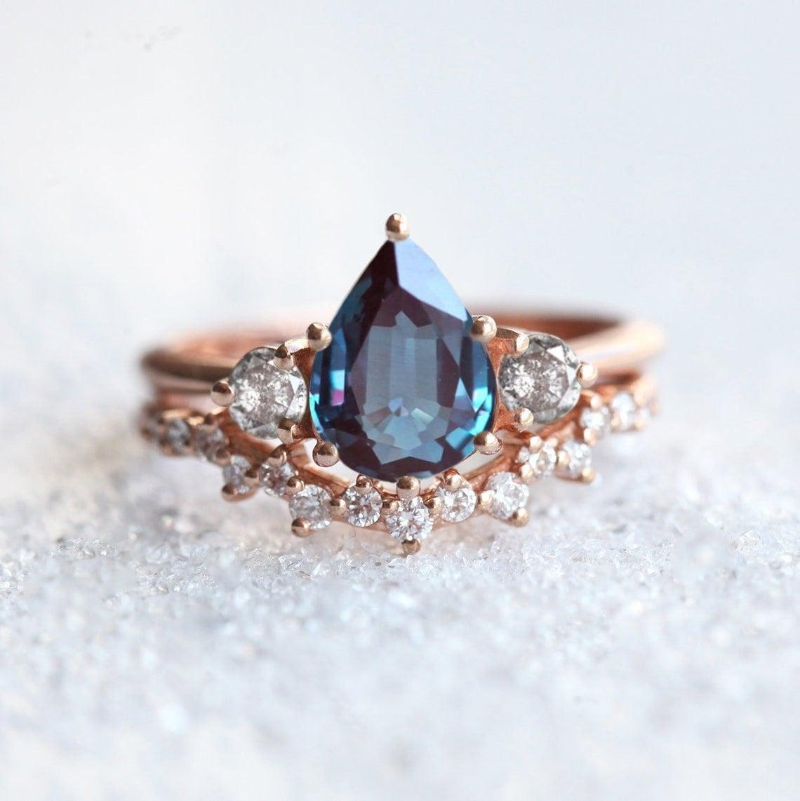 Alexandrite is one of the rarest gems available for rings and is known for its huge color-distorting properties. In natural light, it usually looks green or blue, but under incandescent lights, it transfers to a red or purple tone. This dramatic change adds a layer of mystery and intrigue, which is why many people think it symbolizes adaptability, growth and duality.