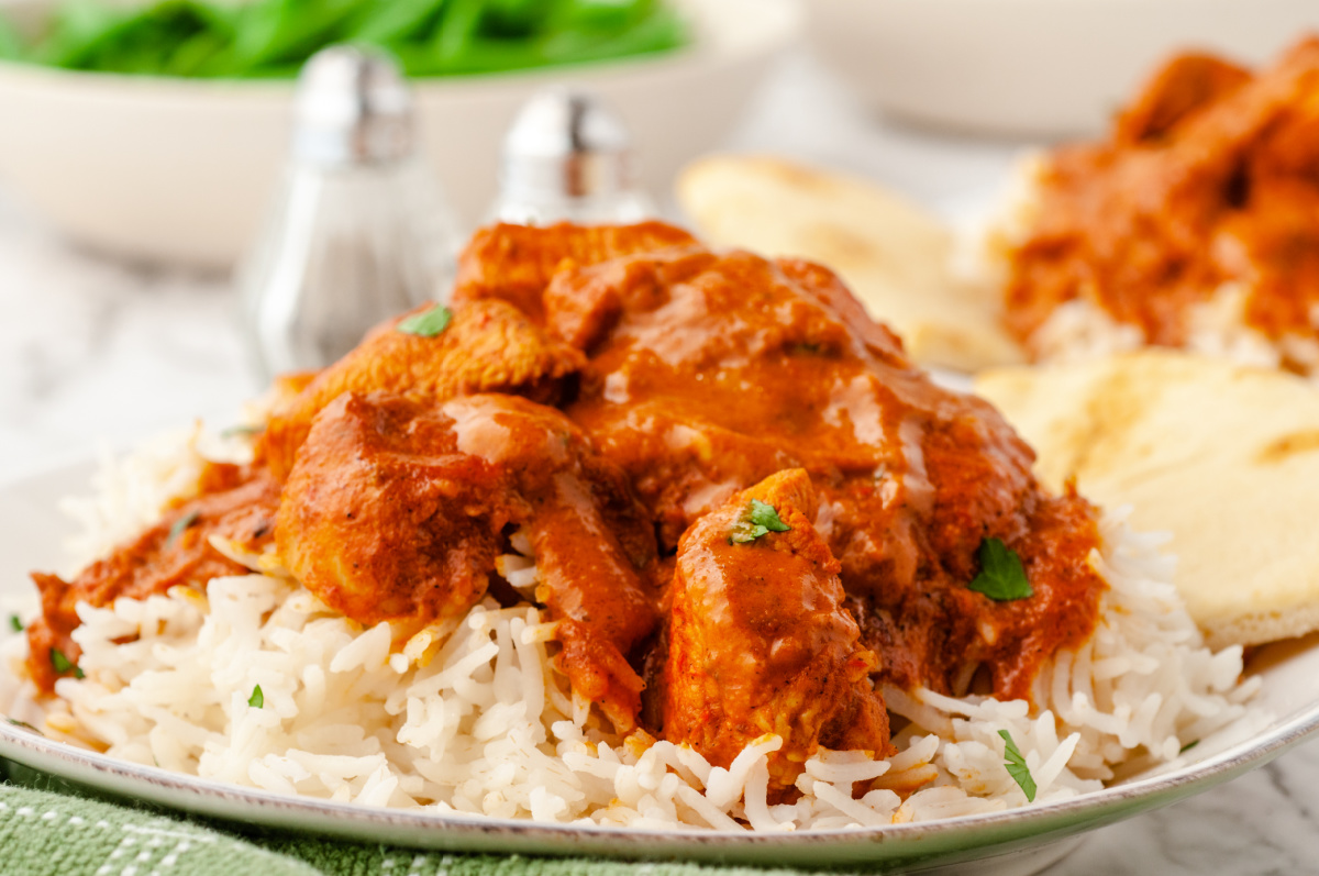 10. On a bed of basmati rice with cilantro or parsley.Butter rice on white riceButter Chicken – Fresh Family Meal