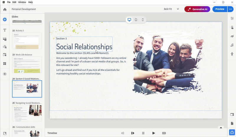 The Generate Text feature in Adobe Captivate isn’t just a nice-to-have, it’s a game-changer. You can improve learning objectives, write better definitions, or simplify content in seconds. No more jumping between tools.