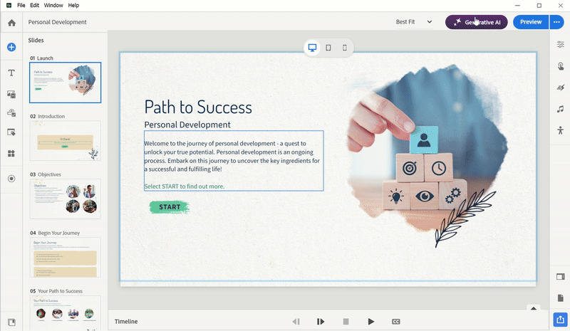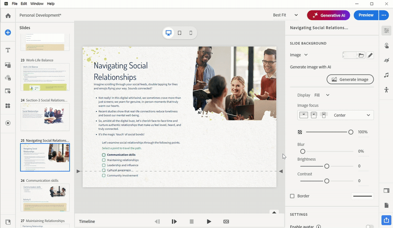 Let’s say you wrote a slide with some inspirational lines but now want the right definition of “personal development”. Just click “Generative AI” in the upper right corner and select “generate text” button to enter your request, for example: